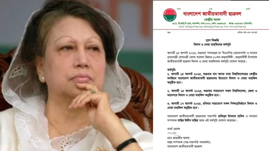 বাংলাদেশ জাতীয়তাবাদী ছাত্রদল আগামী ১৫ আগস্ট ২০২৫, শুক্রবার বিএনপি চেয়ারপারসন ও তিনবারের সাবেক প্রধানমন্ত্রী দেশনেত্রী বেগম খালেদা জিয়ার ৮০তম জন্মবার্ষিকী উপলক্ষে দেশব্যাপী ব্যাপক কর্মসূচি হাতে নিয়েছে। এই বিশেষ দিনটিকে স্মরণীয় করে রাখতে ছাত্রদল কেন্দ্রীয়ভাবে মিলাদ ও দোয়া মাহফিল আয়োজনের ঘোষণা দিয়েছে।