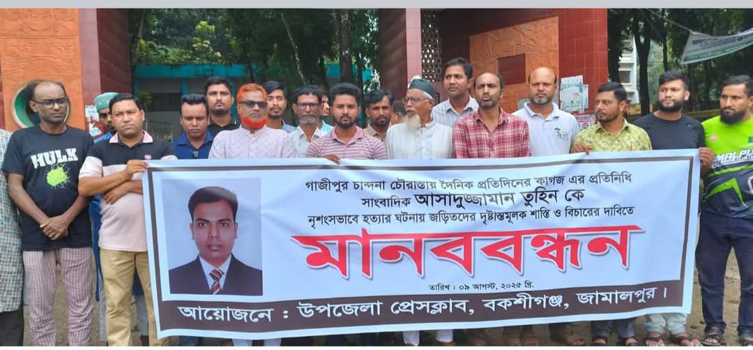 গাজীপুরে সাংবাদিক আসাদুজ্জামান তুহিন হ,ত্যা,র প্রতিবাদে বকশীগঞ্জ জামালপুর মানববন্ধন