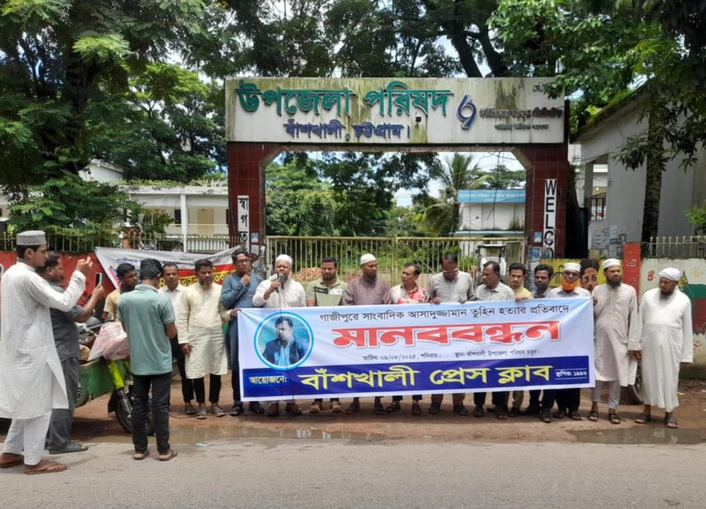 গাজীপুরে সাংবাদিক আসাদুজ্জামান তুহিন হত্যার প্রতিবাদে বাঁশখালী প্রেসক্লাব ও কর্মরত সাংবাদিকদের উদ্যোগে মানববন্ধন ও প্রতিবাদ সভা আজ শনিবার (৯ আগস্ট) দুপুরে উপজেলা পরিষদের গেইটে অনুষ্ঠিত হয়। মানববন্ধন ও সমাবেশ থেকে অবিলম্বে হত্যাকারীদের দৃষ্টান্তমূলক শাস্তি ও সারা দেশে সংবাদকর্মীদের নিরাপত্তা নিশ্চিত করার দাবি জানানো হয়।