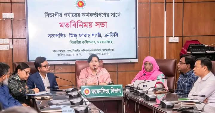 গতকাল বুধবার (১৯ নভেম্বর) বিভাগীয় পর্যায়ের কর্মকর্তাদের সাথে মতবিনিময় সভায় এসব কথা বলেন ময়মনসিংহের সদ্য যোগদানকৃত বিভাগীয় কমিশনার ফারাহ শাম্মী, এনডিসি। দুপুর ১২:০০টায় বিভাগীয় কমিশনার কার্যালয়ের সম্মেলন কক্ষে আয়োজিত এ সভায় বিভাগীয় পর্যায়ের সকল দপ্তরপ্রধানগণ উপস্থিত ছিলেন।