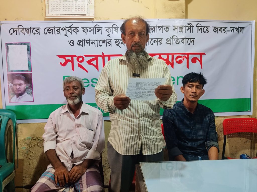 দেবিদ্বারে জোরপূর্বক ফসলি জমি দখলের প্রতিবাদে সংবাদ সম্মেলন।