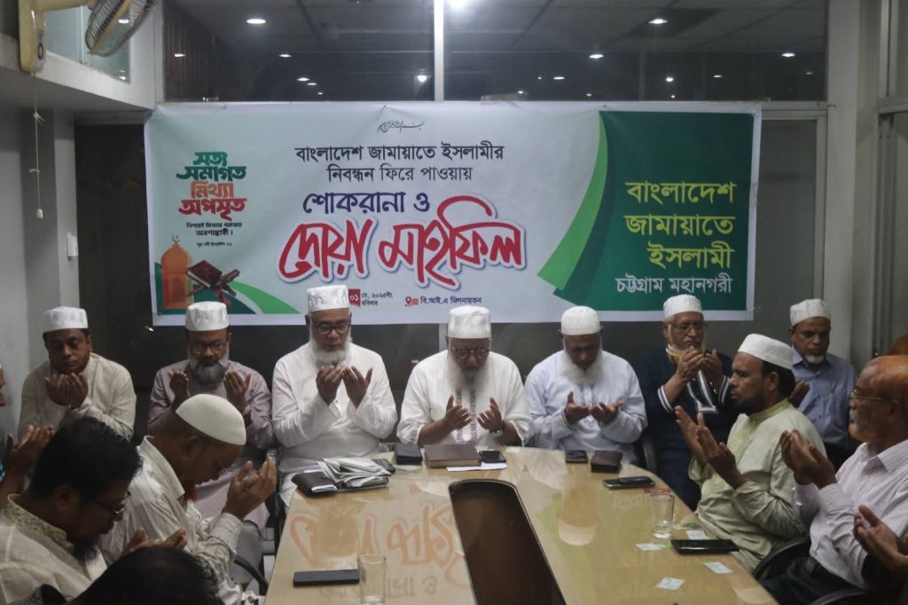 দীর্ঘ এক যুগ পর নিবন্ধন ফিরে পাওয়ায় শোকরানা ও দোয়া মাহফিল করেছে বাংলাদেশ জামায়াতে ইসলামীর চট্টগ্রাম মহানগরী।রবিবার (১ জুন) দুপুর ১টায় চট্টগ্রামের দেওয়ানবাজারস্থ নগর জামায়াতের কার্যালয়ে এই মাহফিল অনুষ্ঠিত হয়।