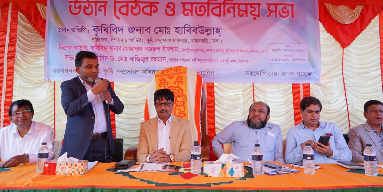 নাটোরের বড়াইগ্রামে কৃষক–কৃষাণীদের নিয়ে পার্টনারশীপ ইন ব্র্যাক ব্যাংক–ডিএই কৃষি উন্নয়ন প্রকল্পের আওতায় উঠান বৈঠক ও মতবিনিময় সভা অনুষ্ঠিত হয়েছে।বৃহস্পতিবার (২০/১১/২০২৫) গড়মাটি কৃষি উন্নয়ন সমিতির উদ্যোগে আয়োজিত এ অনুষ্ঠানে কৃষকদের আধুনিক কৃষি প্রযুক্তি, উৎপাদন বৃদ্ধির কৌশল, সহজ শর্তে ঋণ সুবিধা ও বাজার ব্যবস্থাপনা নিয়ে বিস্তারিত দিকনির্দেশনা প্রদান করা হয়।সভায় সভাপতিত্ব করেন কৃষিবিদ ড. মোঃ আজিজুর রহমান, অতিরিক্ত পরিচালক, কৃষি সম্প্রসারণ অধিদপ্তর, রাজশাহী অঞ্চল।