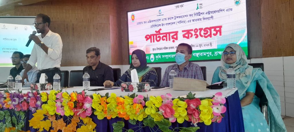 আজ ১৯ জুলাই, ২০২৫ খ্রি. বাঞ্ছারামপুর উপজেলা অডিটোরিয়ামে কৃষি সম্প্রসারণ অধিদপ্তরের উদ্যোগে প্রোগ্রাম অন এগ্রিকালচারাল এন্ড রুরাল ট্রান্সফরমেশন ফর নিউট্রেশন এন্টরপ্রেনরশীপ এন্ড রেসিলিয়েন্স ইন বাংলাদেশ (পার্টনার) প্রকল্পের আওতায় দিনব্যাপী পার্টনার কংগ্রেস অনুষ্ঠিত হয়। অনুষ্ঠানে প্রধান অতিথি হিসেবে উপস্থিত ছিলেন জেলা কৃষি সম্প্রসারণ অধিদপ্তরের উপপরিচালক ড. মোস্তফা এমরান হোসেন এবং সভাপতিত্ব করেন বাঞ্ছারামপুর উপজেলা নির্বাহী কর্মকর্তা ফেরদৌস আরা। বিশেষ অতিথি হিসেবে উপস্থিত ছিলেন মোঃ ময়নুল হক সরকার, অতিরিক্ত উপপরিচালক (শস্য), কৃষি সম্প্রসারণ অধিদপ্তর, ব্রাহ্মণবাড়িয়া ও পার্টনার প্রকল্পের কুমিল্লা অঞ্চলের আনঞ্চলিক মনিটরিং অফিসার কৃষিবিদ সারোয়ার জামান অনুষ্ঠানে প্রোগ্রামের মূল প্রবন্ধ ও কার্যক্রম উপস্থাপন করেন উপজেলা কৃষি অফিসার মোঃ নাসির উদ্দিন । প্রোগ্রামে শেসন পরিচালনা করেন সুষময় ভৌমিক, কৃষি সম্প্রসারণ অফিসার ,বাঞ্ছারামপুর ও সমবায় অফিসারের প্রতিনিধি সহকারী পরিদর্শক সাবিহা সুলতানা। অন্যান্য অতিথিদের মধ্যে বক্তব্য রাখেন উপজেলা প্রাণিসম্পদ অফিসার ডা: কাজী মোস্তাইন বিল্লাহ, উপজেলা মৎস্য অফিসার সাঈদা আক্তার । দিনব্যাপী প্রোগ্রামে উপস্থিত ছিলেন উপজেলা পল্লী উন্নয়ন অফিসার ফারুক ই আজম, জনস্বাস্থ্য প্রকৌশলী সিয়াম আহম্মেদ, বাঞ্ছারামপুর প্রেস ক্লাবের সভাপতি মোঃ নাছির উদ্দিন, বিভিন্ন ইউনিয়ন পরিষদের চেয়ারম্যন/ প্যানেল চেয়ারম্যান বৃন্দ, সাংবাদিক বৃন্দ, বেসরকারী সংস্থার প্রতিনিধি, এলাকার গন্যমান্য ব্যাক্তি , উদ্যোক্তা কৃষক গন, পার্টনার স্কুলের কৃষক ও অন্যান্য কৃ্ষক গন । অনুষ্ঠানে পার্টনার প্রকল্পের পরিচিতি, লক্ষ্য ও উদ্দ্যশ্য, কার্যক্রম, পার্টনার পিএফএস সেবা কেন্দ্রের কার্যক্রম ও করনীয়, আয়বর্ধণমূলক কর্মকার্ড, উত্তম কৃষি চর্চা , বাঞ্ছরামপুর উপজেলায় পার্টনার প্রোগ্রামের কার্যক্রম ও ভবিষ্যৎ নিয়ে আলোচনাও উপস্থিত অংশগ্রহণকারীদের সাথে মত বিনিময় করা হয়।
