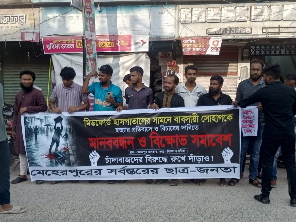মিডফোর্ডের সামনে ব্যবসায়ীকে হ*ত্যার প্রতিবাদে মেহেরপুরে মানববন্ধন