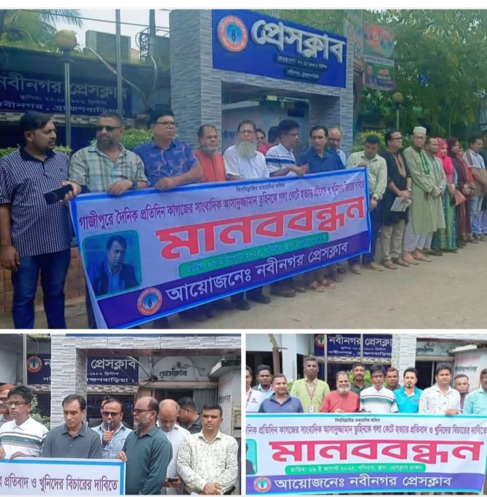 আজ ৯ আগস্ট ২০২৫ শনিবার নবীনগর প্রেস ক্লাবের আয়োজনে দৈনিক প্রতিদিনের কাগজের বিশেষ প্রতিনিধি আসাদুজ্জামান তুহিন হত্যার বিচারের দাবিতে মানববন্ধন অনুষ্ঠিত হয়েছে।