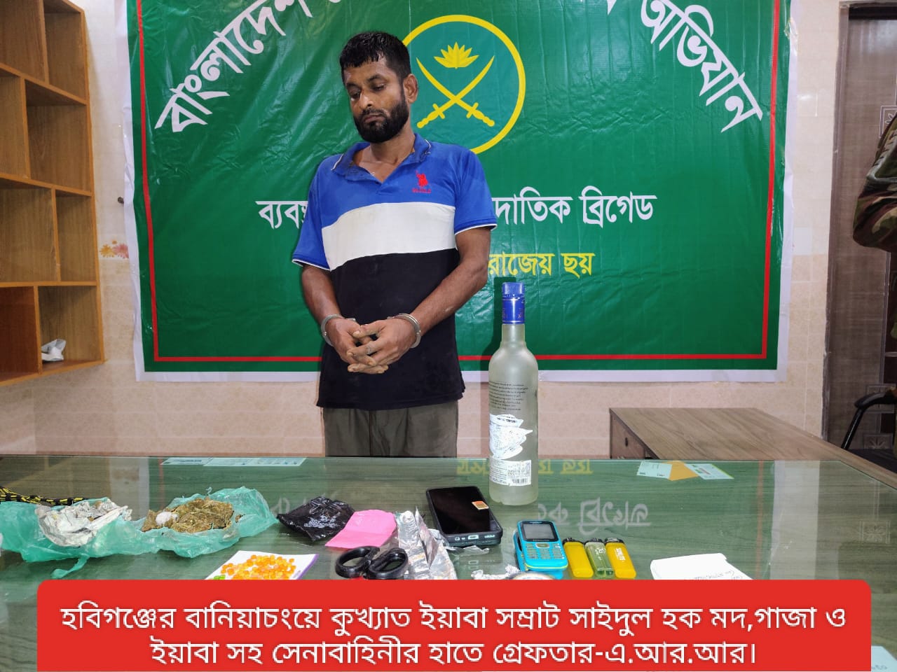 হবিগঞ্জের বানিয়াচংয়ে সেনাবাহিনীর অভিযানে শীর্ষ ইয়াবা সম্রাট সাইদুল হক(৪০)মাদক সহ গ্রেফতার হয়েছে। এসময় সেনাবাহিনী গ্রেফতারকৃত সাইদুলহক এর কাছ থেকে ৮৪পিস ইয়াবা,আড়াইশ গ্রাম গাঁজা ও ৮ পিস ইয়াবা কন্ট্রোলার ও ১লিটারের ১টি বিদেশি মদের বোতল,ফুয়েল পেপার০৪ পিস,মোবাইল ফোন ০৪ টি,দেশী কেচি ২ টি ও ইয়াবা বিক্রির ১টি নোট খাতা উদ্ধার করা হয়েছে।