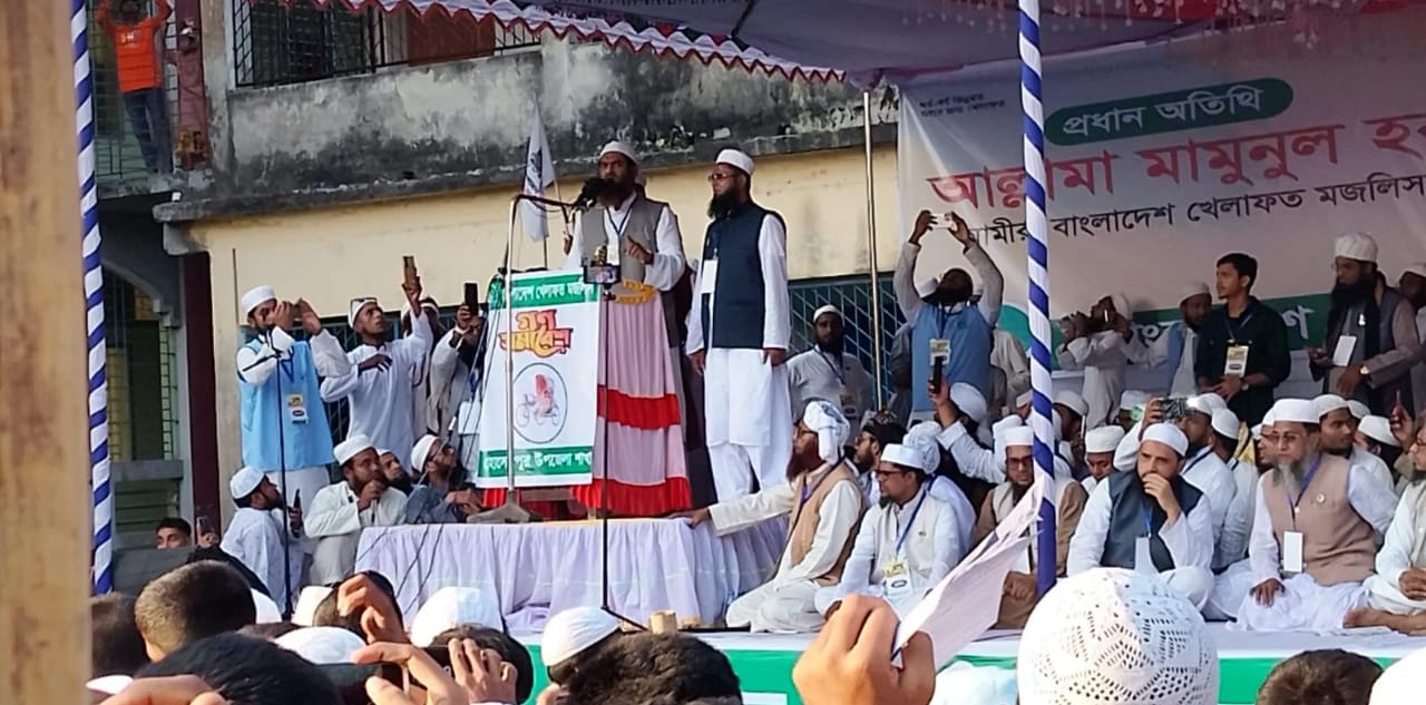 হোসেনপুর কিশোরগঞ্জ থেকে : দেশের মানুষ এখন ইসলামের বাংলাদেশ দেখতে চায় বলে বাংলাদেশ খেলাফত মজলিসের আমীর আলামা মামুনুল হক বলেছেন। বিগত ১৫ বছর বড় বড় দলগুলো ফ্যাসিবাদ মুক্ত করার জন্য বহু চেষ্টা করেও তারা কিছু করতে পারেনি। কিন্তু আমরা এতে সফল হয়েছি। তিনি বিভিন্ন সময়ে ক্ষমতালোভী রাজনৈতিক দলগুলোকে ইঙ্গিত করে বলেছেন তারা ক্ষমতায় গিয়ে নিজেদের ভাগ্য পরিবর্তন করেছে, সাধারন মানুষের জন্য কিছু করেনি, একদল খেয়েছে আরেকদল খাওয়ার জন্য ক্ষমতায় যেতে চায়। তার দল ক্ষমতায় গেলে ৪৭,৭১,২৪ এর অনুপ্রেরনায় দেশ পরিচালনা করবেন এবং ৭২ এর সংবিধান ছুড়ে ফেলবেন তাই জনগনকে সাথে নিয়ে তিনি ইসলামের বাংলাদেশ গড়তে চান। জনসভায় উপস্থিত জনসাধারণের উদ্দেশ্যে বলেন গণভোটে হাঁ ব্যালটে ভোট দেয়ার আহব্বান জানিয়েছেন। মঙ্গলবার (২৫ নভেম্বর ২০২৫) বিকেল ৩ ঘটিকায় কিশোরগঞ্জের হোসেনপুরে বাংলাদেশ খেলাফত মজলিসের আয়োজনে উপজেলার কেন্দ্রীয় পৌর সদর নতুন বাজার ঈদগাঁহ মাঠে অনুষ্ঠিত বিশাল জনসভায় প্রধান অতিথির বক্তব্যে এ আহ্বান জানিয়েছেন ৷ এতে সভাপতিত্ব করেন হোসেনপুর উপজেলা খেলাফত মজলিশের আমীর মাওলানা আবুল কালাম ফারুকী । জনসভায় কিশোরগঞ্জ-১ হোসেনপুর-কিশোরগঞ্জ সদর) আসনে বাংলাদেশ খেলাফত মজলিসের সংসদ সদস্য প্রার্থী হিসেবে কেন্দ্রী সাংগঠনিক সম্পাদক মুফতি হেদায়াতুল্লাহ হাদীকে রিকশা প্রতিকে ভোট দেয়ার আহব্বান জানিয়েছেন। এতে বিশেষ অতিথি ছিলেন,খেলাফত মজলিশের কেন্দ্রিয় সিনিয়র যুগ্ম মহাসচিব মাওলানা আতাউল্লাহ আমীন, যুগ্ম মহাসচির মাওলানা আব্দুল আজিজ, কেন্দ্রিয় নেতা মাওলানা ফজলুর রহমান, মাওলানা মোহাম্মদ আলী, জেলা সভাপতি মাওলানা আব্দুল করিম, মাওলানা আব্দুল মোমেন শেরজাহান, মাওলানা জুবায়ের আহমদ, মাওলানা সায়িদ আবু সায়েম, মাওলানা খাইরুল ইসলাম ঠাকুর, মাওলানা আবদুল্লাহ আল আমিন, মাওলানা শফিকুল ইসলাম আজিজী, মুফতী মুহাম্মদ ইলিয়াস কাসেমী, মাওলানা ওসমান গনি কাগজি, মাওলানা আব্দুল কাদির হাসেমী প্রমুখ।