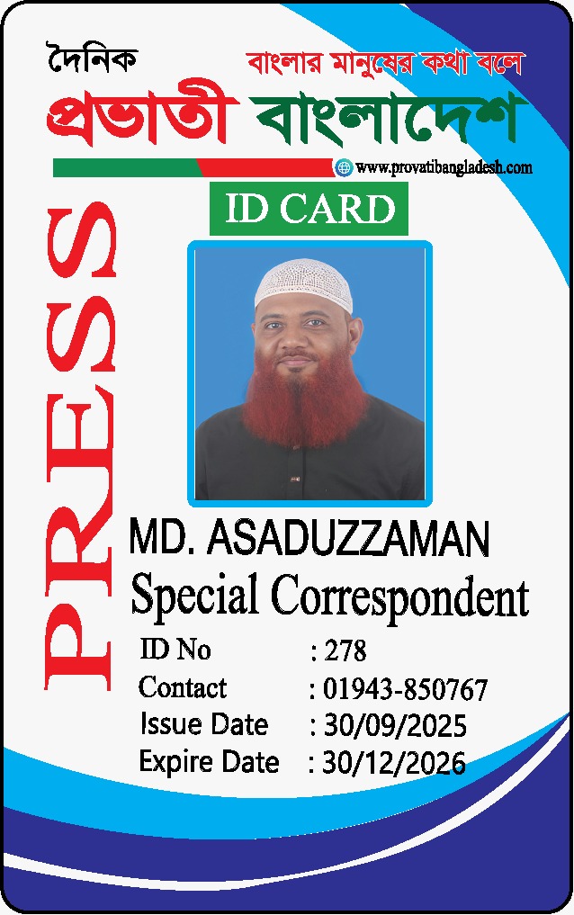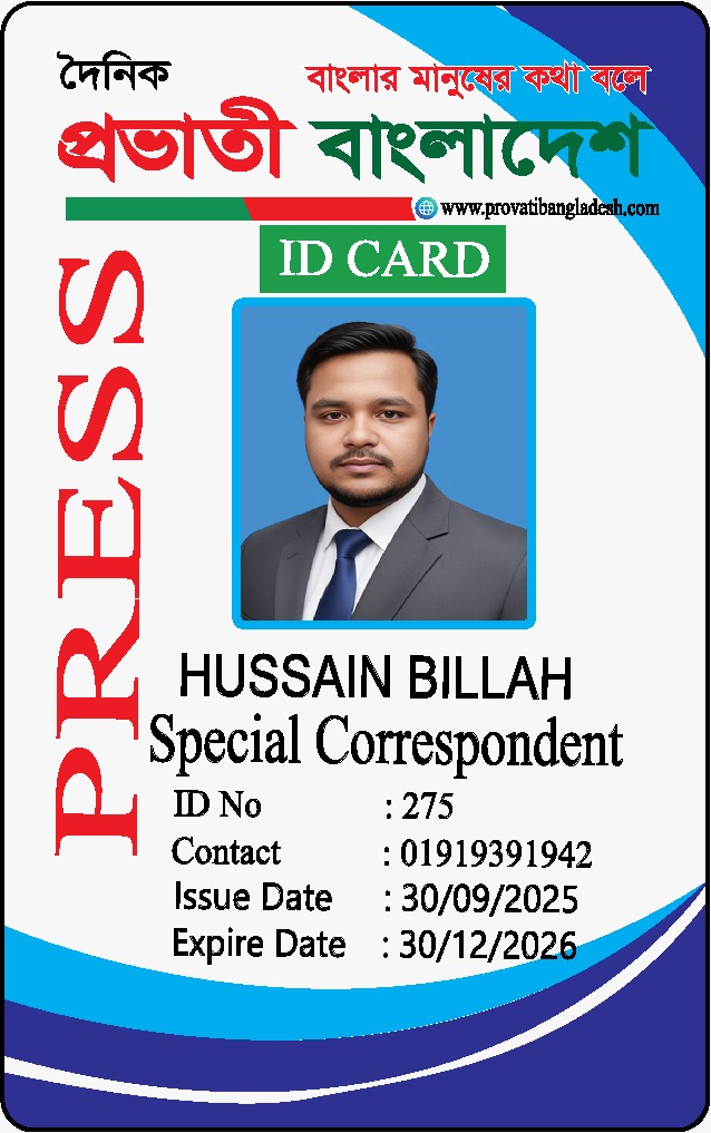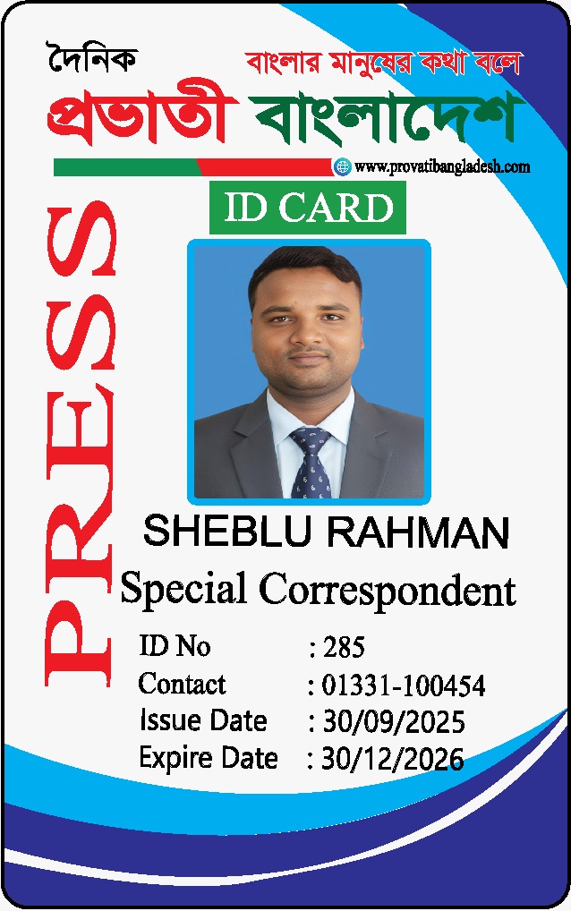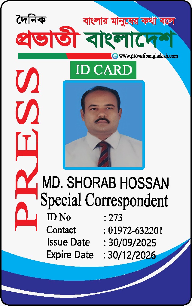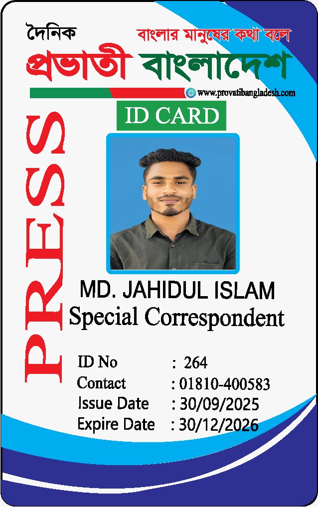 দৈনিক প্রভাতী বাংলাদেশ পরিবারের পক্ষ থেকে সকলকে জানাই আন্তরিক শুভেচ্ছা ও অভিনন্দন। সম্মানিত পাঠক ও শুভানুধ্যায়ীদের অবগতির জন্য জানানো যাচ্ছে যে, দৈনিক প্রভাতী বাংলাদেশ ২০২৬ সাল থেকে সকল অনুমোদিত প্রতিনিধির ছবি আমাদের পরিবার ওয়েবসাইটে দেওয়া হলো ওয়েবসাইটে ছবিবিহীন কোনো ব্যক্তি যদি নিজেদের দৈনিক প্রভাতী বাংলাদেশ এর প্রতিনিধি হিসেবে পরিচয় দেয় অথবা আইডি কার্ড প্রদর্শন করে, তবে বুঝতে হবে যে তারা ভুয়া। এমন পরিস্থিতিতে, সংশ্লিষ্ট ব্যক্তিকে নিকটস্থ আইনশৃঙ্খলা রক্ষাকারী বাহিনীর হাতে তুলে দেওয়ার জন্য বিশেষভাবে অনুরোধ করা হচ্ছে। আমরা আপনাদের সহযোগিতা কামনা করি। ধন্যবাদান্তে, দৈনিক প্রভাতী বাংলাদেশ https://www.provatibangladesh.com/family/প্রকাশক-ও-সম্পাদক-সরোয়া/ https://www.provatibangladesh.com/family/৮-বিভাগের-ব্যুরো-প্রধান/ https://www.provatibangladesh.com/family/বিশেষ-প্রতিনিধি/ https://www.provatibangladesh.com/family/স্টাফ-রিপোর্টার/ https://www.provatibangladesh.com/family/উপজেলা-প্রতিনিধি/ https://www.provatibangladesh.com/family/জেলা-প্রতিনিধি/